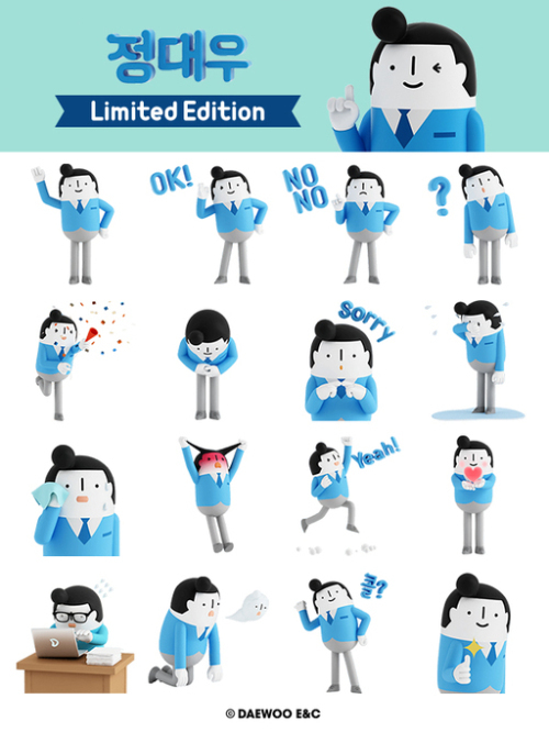 8일 대우건설에 따르면 이번에 만든 정대우 이모티콘은 움직이는 스티커 이모티콘 16종으로 대우건설 임직원들에게 금일부터 180일간 무료로 사용할 수 있도록 배포될 예정이다.