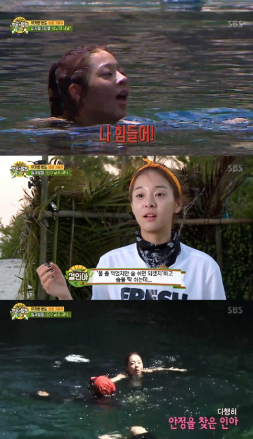 앞서 설인아는 뛰어난 수영 실력을 보였다. 물 속으로 들어간 설인아는 생각보다 깊은 수심에 당황했다. 수영을 하던 중 지나치게 긴장을 한 탓인지 제대로 수영을 하지 못했다.