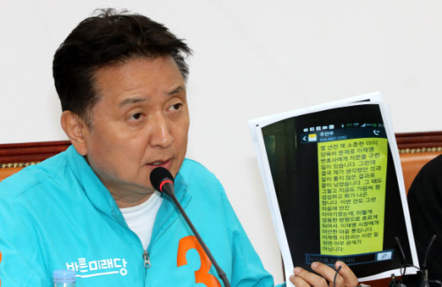 | 바른미래당 김영환 경기지사 후보가 8일 오후 국회에서 열린 기자간담회에서 더불어민주당 이재명 후보에 대한 배우 김부선씨 사과문 대필 의혹과 관련 "내일부터 침묵의 동조자 이름을 밝히겠다"고 발언하고 있다. 연합뉴스 |
