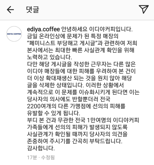 전날 올라온 입장문은 “금일 온라인상에 문제가 된 특정 매장의 ‘페미니스트 부당해고 게시글’ 관련 최대한 빠른 사실관계 확인을 위해 노력하고 있다”며 “본 건과 무관한 전국 1만여명의 이디야커피 가족들에게 선의의 피해가 발생되지 않도록 해 달라”고 밝혔다.