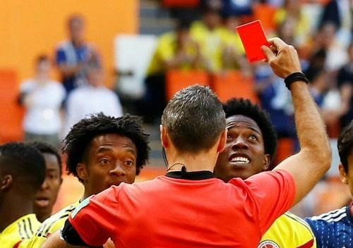 | 콜롬비아 미드필더 카를로스 산체스가 핸드링 파울을 범해 전반 3분 만에 퇴장당했다. 사진=연합뉴스 |