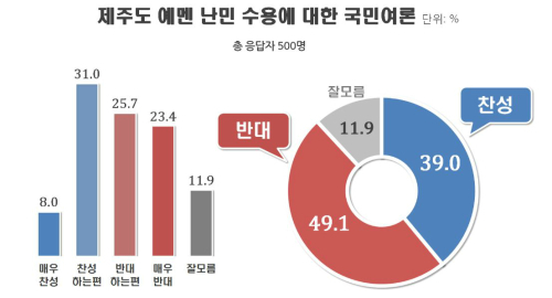 21일 여론조사 전문기관 리얼미터가 tbs 의뢰로 지난 20일 19세 이상 성인 500명을 조사해 발표한 결과를 보면 예멘 난민 수용을 반대한다(매우 반대 23.4%, 반대하는 편 25.7%)는 응답이 49.1%로, 찬성한다(매우 찬성 8.0%, 찬성하는 편 31.0%)는 응답(39.0%)보다 10.1%p 앞서는 것으로 집계됐다.