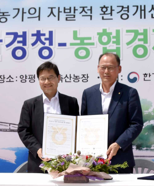 | 농협 축산경제는 21일 경기도 양평군 소재 축산농가에서 수질오염과 깨끗한 축산환경 조성을 위해 한강유역환경청과 “축산농가의 자발적 환경개선을 위한 MOU”를 체결하였다. 나정균 한강유역환경청장(왼쪽), 농협 김태환 축산경제대표이사(오른쪽) 사진=농협 제공 |