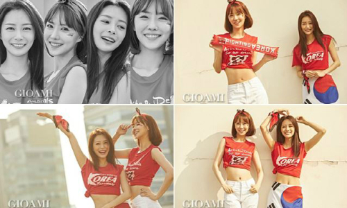이번 화보는 디지털 매거진 지오아미코리아(GIOAMI KOREA)가 기획했다. 화보 속 두 사람은 붉은 악마 셔츠를 감아올려, 배꼽을 살짝 드러내는 ‘심쿵’ ‘숨멎’ 응원룩을 연출했다. 또한 얼굴에 태극 문양을 상징하는 페이스 페인팅을 해 승리를 기원하는 마음을 표현했다.