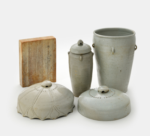 | 성종 태항아리. 태지석, 내항아리, 외항아리, 외항아리 뚜껑, 별도 뚜껑(뒷줄 왼쪽부터 시계방향)으로 구성된 조선 성종 임금의 태항아리. 1930년 일제가 원래 태실에서 파내 경기도 고양의 서삼릉으로 이전하면서 한 세트를 이루던 것이 흩어졌고, 지금도 국립박물관 3곳에 분리돼 소장되어 있다. 국립고궁박물관 제공 |