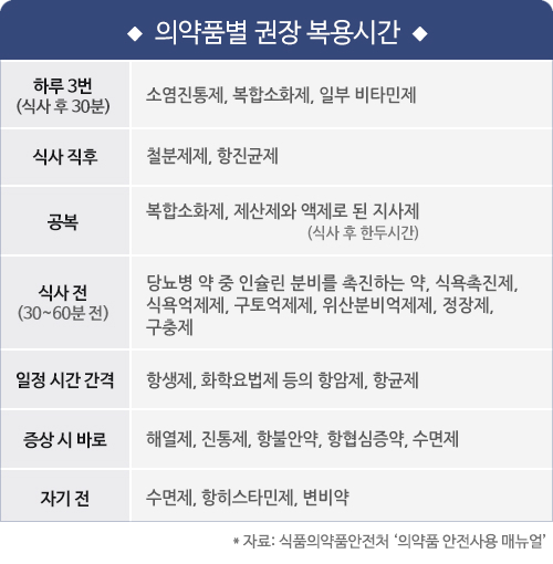 위장 장애를 일으킬 수 있거나 음식과 함께 흡수될 때 더 좋은 효과를 나타내는 의약품은 식사 직후 복용하는 것이 좋다. 섭취한 음식이 위점막을 보호해 복용에 따른 속쓰림이 그만큼 덜하다. 철분제제와 항진균제 등이 대표적이다.