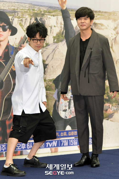 가수 하현우(왼쪽)와 윤도현이 11일 오전 서울 상암동 스탠포드호텔에서 열린 tvN 예능프로그램 '이타카로 가는 길'의 제작발표회에 참석해 포즈를 취하고 있다.