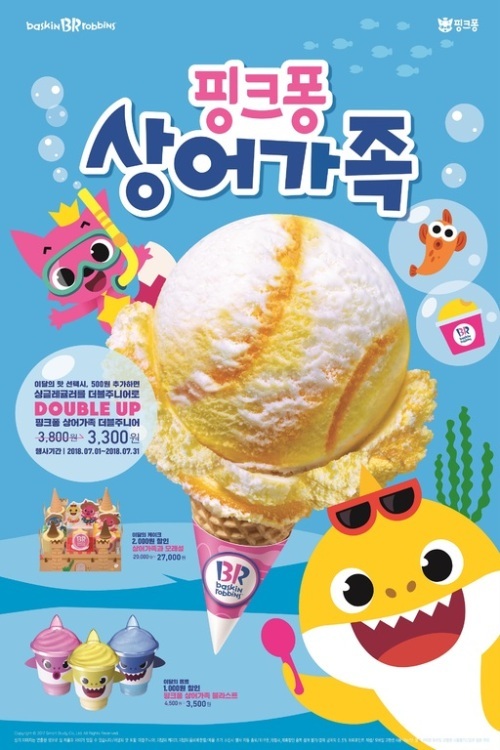 한편 배스킨라빈스는 인기 캐릭터 ‘핑크퐁상어가족’(사진)과 손잡고 7월 ‘이달의 맛’을 출시했다. 달콤한 망고 요거트 아이스크림과 상큼한 파인애플 요거트 아이스크림의 조합에 망고 리본이 첨가돼 열대 과일 특유의 색감과 풍미를 살렸다.