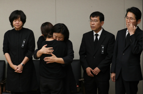 정의당 이정미(왼쪽 첫번째), 심상정( “ 3번째) 의원 등이 23일 서울 신촌 세브란스병원에 마련된 노회찬 정의당 원내대표 빈소에서 조문객들을 맞이하고 있다. 뉴시스