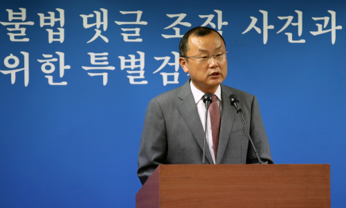 드루킹 댓글 조작사건을 수사 중인 허익범 특별검사팀 대변인 박상융 특검보가 언론을 상대로 브리핑을 하고 있다. 세계일보 자료사진