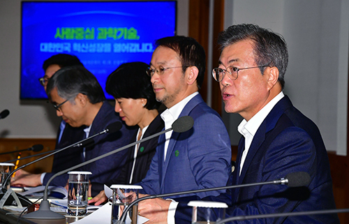 | 과학기술자문회의 주재 문재인 대통령이 26일 청와대에서 열린 제1차 국가과학기술자문회의 전원회의에서 인사말을 하고 있다. 이제원 기자 |