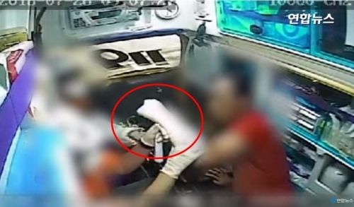 폭행 당한 구급대원이 이를 막기 위해 팔을 잡고 말리는 상황.