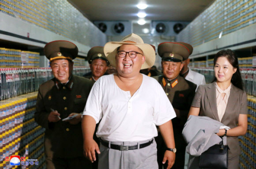| 8일 조선중앙통신이 보도한 김정은 국무위원장의 황해남도 금산포젓갈공장 시찰 모습. 시원한 차림의 김 위원장은 부인리설주 여사와 함께 젓갈공장을 둘러보면서 만족감을 나타냈다. 연합뉴스 |
