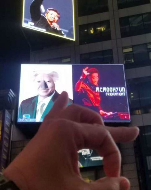 | 지난 1월 미국 뉴욕 타임스퀘어 광장에 노무현 전 대통령의 합성사진을 송출한 일베회원. 출처=일베 |