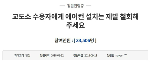 교도소 에어컨 설치를 반대한다는 국민청원이 제기돼 3만명이 넘는 네티즌들로부터 서명을 받았다.