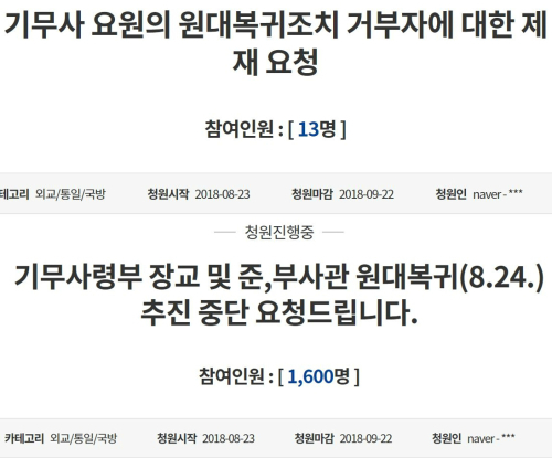 반면 원대복귀 거부자를 제재하라는 맞불 성격의 청원도 올라 왔다.