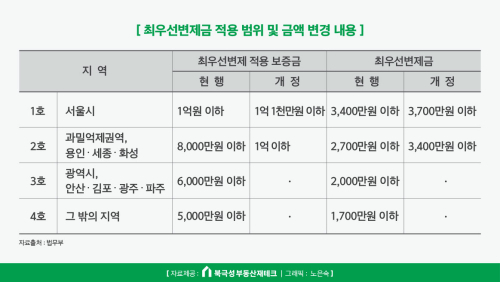 과밀억제권역, 용인, 세종, 화성시의 경우 최우선변제를 받을 수 있는 임차인의 범위가 현재 보증금 8,000만원 이하에서 1억원 이하로 넓어지고, 최우선변제금은 현재 2,700만원 이하에서 3,400만원 이하로 증액되었습니다.