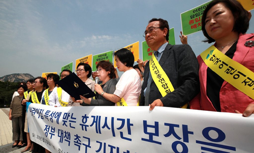 | 지난 6월 한국어린이집총연합회 관계자들이 근로기준법 개정안 시행을 앞두고 보육교사의 휴게시간 보장을 위한 대책을 촉구하는 집회를 열고 있다. 연합뉴스 |