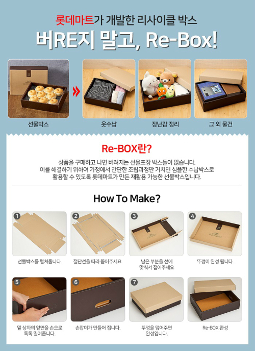 이런 가운데 롯데마트는 단순히 ‘1회용품 사용 줄이기’를 넘어 제품 제작 단계부터 포장재를 줄이고자, 선물세트 포장재를 리폼해 고급 수납용 박스로 사용할 수 있는 ‘리사이클 박스’를 개발했다.