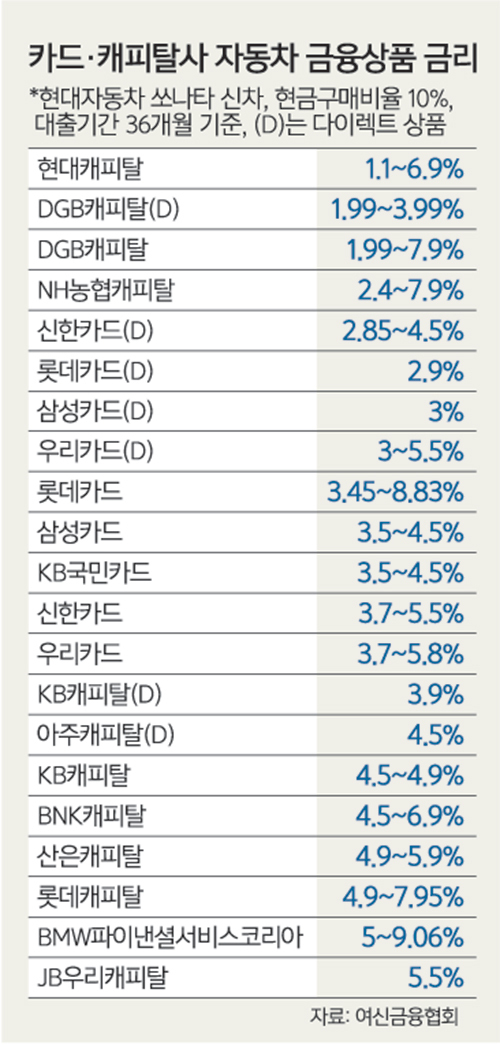 프로모션을 잘 만난다면 1∼2%대 금리도 가능하다. 여신금융협회 공시실을 보면 쏘나타 신차 기준으로 현금구매비율 10%, 대출기간 36개월로 설정했을 때 현대캐피탈 상품 금리는 최저 1.10%에서 시작한다. 같은 조건에서 DGB캐피탈의 최저금리가 1.99%로 조회된다. 여신업계 관계자는 “판매촉진을 위해 제조사와 금융사가 함께 프로모션을 진행할 경우 금리경쟁력이 가장 세다”고 말했다.