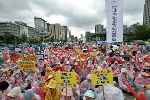 문재인정부의 내년도 최저임금 인상에 반발하는 소상공인연합회가 29일 서울 광화문광장에서 대규모 집회를 열고 청와대까지 행진했다. 비가 내리는 궂은 날씨에도 전국에서 모인 주최 측 추산 3만여명의 소상공인은 “최저임금법 시행령 개정안을 전면 재검토하라”고 정부에 촉구했다.