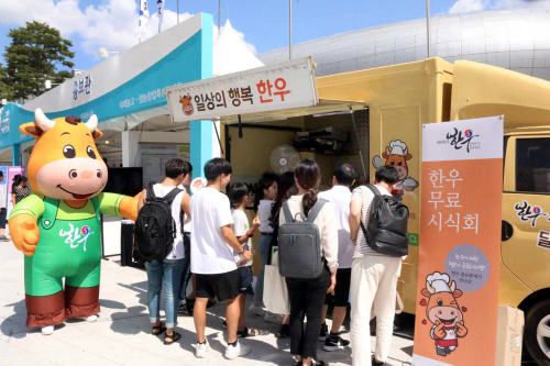 | 1~2일 양일간 서울 동대문구 동대문디자인플라자에서 열린 ‘2018 농림축산식품 일자리박람회’에서 관람객들이 한우 요리 시식을 위해 길게 줄 서있다. 사진=한우자조금 제공 |