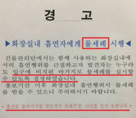 한 건물의 화장실에 담배를 피우면 '물벼락'으로 응징하겠다는 경고문이 부착됐다.