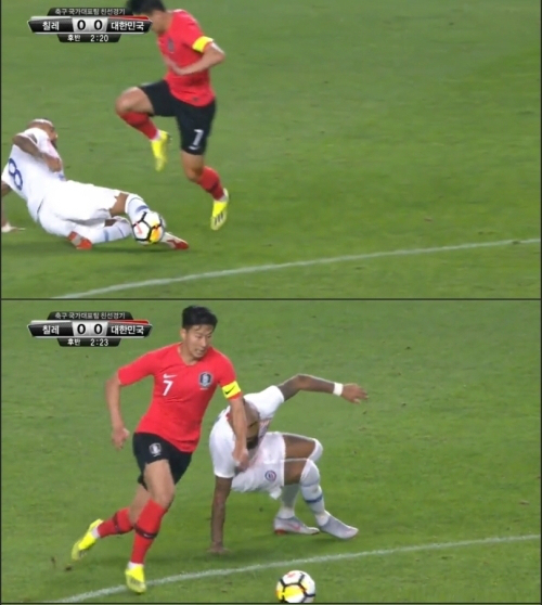 이날 경기 후반 2분쯤 칠레 공격수 아르투로 비달(위에서 두번째 사진 오른쪽·FC 바르셀로나)이 손흥민의 드리블을 끊기 위해 태클을 시도했다.