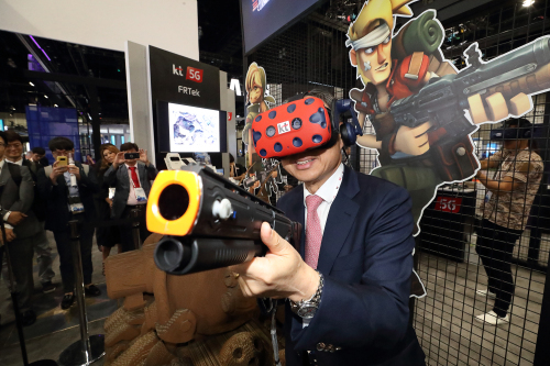 | 황창규 KT 회장이 12일(현지시간) 미국 LA에서 개막한 MWC아메리카 2018 KT 전시관에서 가상현실(VR)을 이용한 ‘메탈슬러그’ 게임을 체험하고 있다. KT제공 |