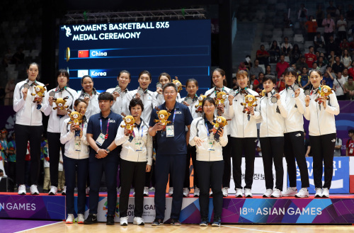 | 2018 자카르타 아시안게임 여자농구 남북단일팀이 은메달을 따낸 뒤 시상식에서 포즈를 취하고 있다.자카르타=연합뉴스 |