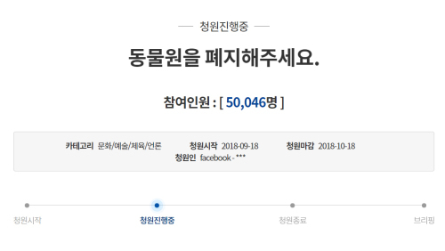 | 지난 18일 청와대 국민청원 게시판 올라온 동물원 폐지 청원. 청와대 홈페이지 |
