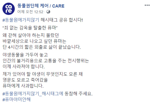 동물단체도 동물원 폐지 여론을 거들었다. 동물단체 ‘케어’는 19일 공식 페이스북에 “#동물원에가지 않기 해시태그 공유하자”는 글을 남겼다. 케어는 “야생동물을 가두어 놓고 인간의 볼거리용으로 고통을 주는 전시행위는 이제 사라져야 한다”며 “제가 있어야 할 야생이 무엇인지도 모른 채 영문도 모르고 죽어갔을 퓨마에게 사과한다. #동물원에 가지 않기 해시태그에 동참해 달라”고 했다.