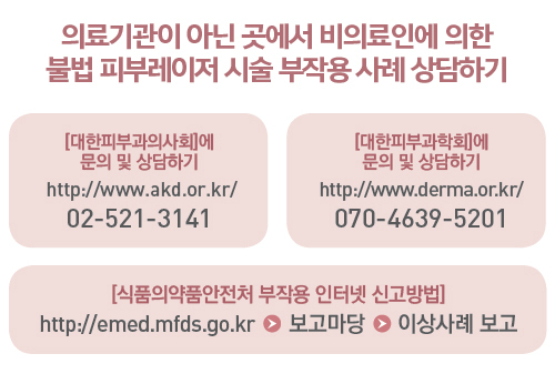 단 참기 힘든 통증이나 과도한 물집, 심한 붉음증이나 붓기, 피부 손상, 가려움 등 시술 부위에 예상치 못한 부작용이 생기면 치료받은 병·의원에 즉시 문의해야 한다. 뾰루지 등 2차 감염이 의심돼도 마찬가지다. 심한 각질이 지속적으로 일어나 피부가 벗겨지고 시술 부위가 파이는 등 흉터가 발생했어도 문의하는 게 좋다. 실제로 시술에 따른 부작용으로는 물집이나 화상, 여드름 모양 발진, 감염으로 인한 피부 염증 반응, 함몰 및 흉터 등을 들 수 있다.
