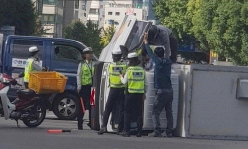 30일 경찰 등에 따르면 해당 사진은 지난달 28일 오후 2시55분 부산 연제구 연산로터리 부근에서 벌어진 교통사고 현장 모습인 것으로 드러났다. 당시 신호를 위반한 흰색 라보 차량이 파란색 포터 차량을 들이받은 뒤 왼쪽으로 넘어진 것으로 알려졌다.