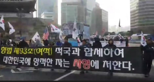| 태극기 부대가 정부의 진보적 조치에 항의하는 의미에서 여적죄 문구가 적힌 플랜카드를 들고 행진하는 모습. 여적죄는 지난 1일 국회 대정부 질문에서 자유한국당 안상수 의원이 꺼집어 내 많은 사람들의 관심을 모았다. 사진=YTN 캡처 |
