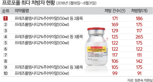 8일 국회 보건복지위원회 정춘숙 의원(더불어민주당)이 식품의약품안전처에서 제출받은 ‘동일성분(프로포폴) 최다 처방 환자 현황’ 자료에 따르면 지난 5월18일부터 8월31일까지 석 달 남짓한 기간 A씨는 프로포폴 성분의 ‘프레조폴엠시티2%주(바이알·50mL)’ 등 2개 품목을 171회에 걸쳐 186개 처방받았다.
