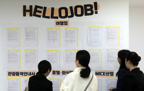 | 관광산업 미니잡페어 17일 서울 중구 한국관광공사 서울센터에서 열린 ‘관광산업 미니잡페어’에 참석한 구직자들이 구인 내용을 담은 게시판을 유심히 들여다보고 있다. 연합뉴스 |