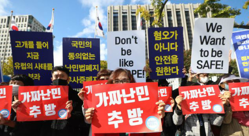 | 18일 '난민대책 국민행동' 회원들이 종로구 정부서울청사 앞에서 예멘인 362명에 대한 인도적 체류 허가에 반발해 집회를 진행하고 있다. 뉴시스 |