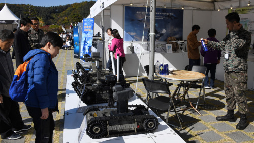 20일 열린 ‘2018 세계 드론 엑스포’를 찾은 시민들이 육군에서 사용 중인 드론봇을 살펴보고 있다.