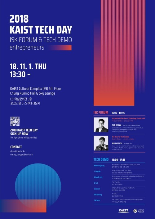 행사는 스타트업 전문가를 초청해 최신의 이슈와 트렌드를 논의하는 ‘Institute for Startup KAIST 포럼’과 미래 핵심기술을 기반으로 창업한 7개 카이스트 학생 스타트업의 기술발표 행사인 ‘테크데모’로 나눠 진행된다.