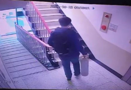 | 부산 일가족 살인 혐의를 받고있는 피의자가 질소 가스통을 들고 아파트로 들어가는 모습이 담긴 CCTV영상 . 부산경찰청 제공 |