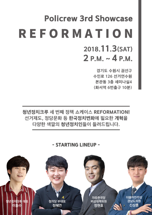 정책 쇼케이스는 청년정치크루의 정기 행사로, 아이돌 그룹의 쇼케이스처럼 새로운 정책을 유권자들에게 소개한다는 취지로 열리고 있다. 이번 쇼케이스에서는 더불어민주당 신상훈(28) 경남도의원의 ‘함께 만드는 젊은 파란-선거제도와 정당 개혁’ 강연을 시작으로 자유한국당 정현호(31) 비상대책위원의 ‘젊은 대한민국을 위한 청년 정치혁명-정치 개혁’, 정의당 정혜연(29) 부대표의 ‘정치가 불평등을 해결할 수 있을까?-불평등과 사회경제적 개혁’, 청년정치크루 이동수(30) 대표의 “선거운동 없는 선거법-공직선거법 개혁” 등 폭넓은 주제로 강연이 진행된다.