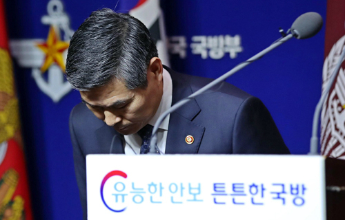 고개 숙인 국방장관 정경두 국방부 장관이 7일 오전 서울 용산구 국방부 브리핑룸에서 5·18 민주화운동 당시 계엄군이 성폭행을 자행했다는 사실이 국가기관 공식 조사로 확인된 것과 관련해 고개 숙여 사과하고 있다. 연합뉴스 |