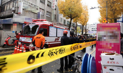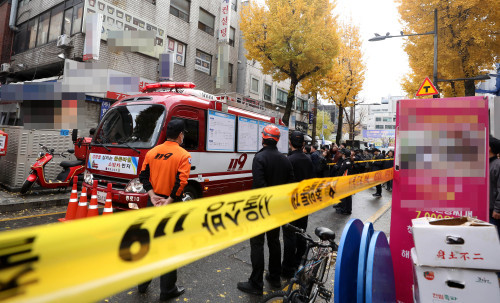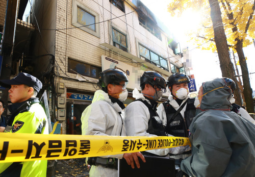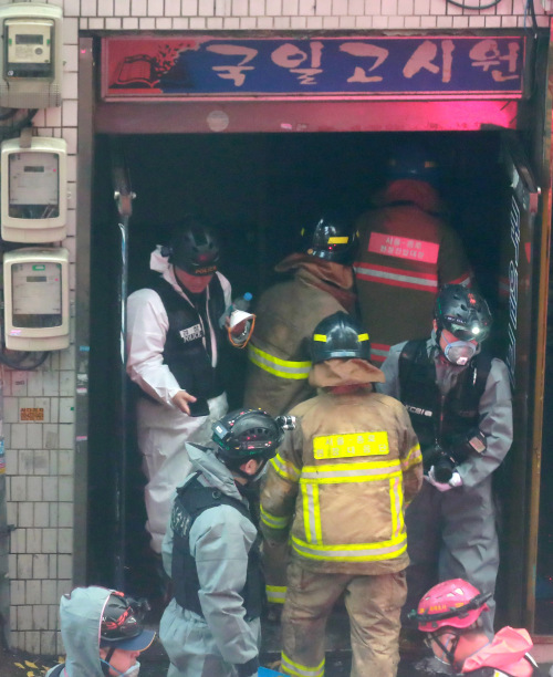 | 9일 오전 화재가 발생한 서울 종로구 관수동의 국일고시원에서 경찰, 소방대원들이 고시원 입구를 오가고 있다. 사진=연합뉴스 |