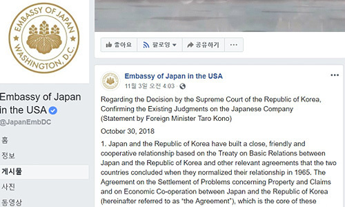 사진은 ‘한국의 국제법 위반을 시정하기 위한 즉각적 조치를 포함한 적절한 조치를 강력히 요구한다’ 등 고노 외무상의 발언을 게시한 주미 일본대사관 페이스북.