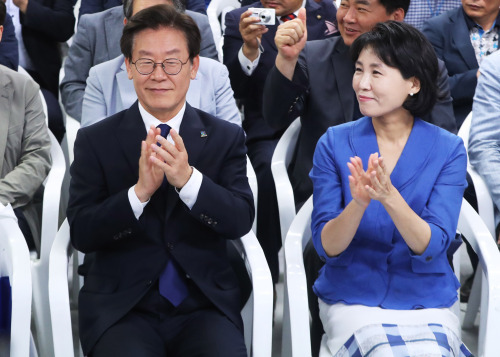 | 지난 6월13일 지방선거 투표 당일 더불어민주당 이재명 경기도지사 후보(왼쪽)가 부인 김혜경씨와 출구조사 결과를 지켜보며 박수를 치고 있다. 수원=연합뉴스 |