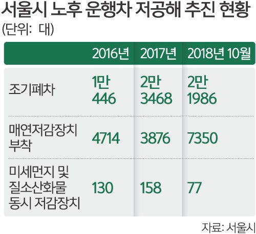 시는 조기폐차 목표치를 올해 2만2000대에서 내년에는 4만대로 늘리기로 했다. 시는 폐차 보조금을 제공하는 방식으로 노후 경유차의 폐차를 유도하고 있다.