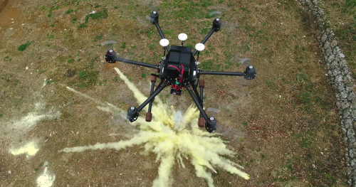 | 드론이 상공 50m에서 소화탄을 투척해 불을 끄고 있다. 세계일보 자료사진 |