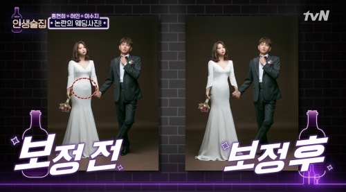 | 홍현희가 웨딩 사진 보정 전과 후 사진을 공개, 큰 차이를 보이지 않았다. |