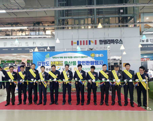 | 29일 서울 서초구 농협하나로마트 양재점에서 개최된 ‘강원도 브랜드 축산물 판매전’에서 농협유통 이수현 대표이사(오른쪽에서 7번째), 강원한우조합 김천일(오른쪽에서 1번째)가 기념촬영을 하고 있다. |